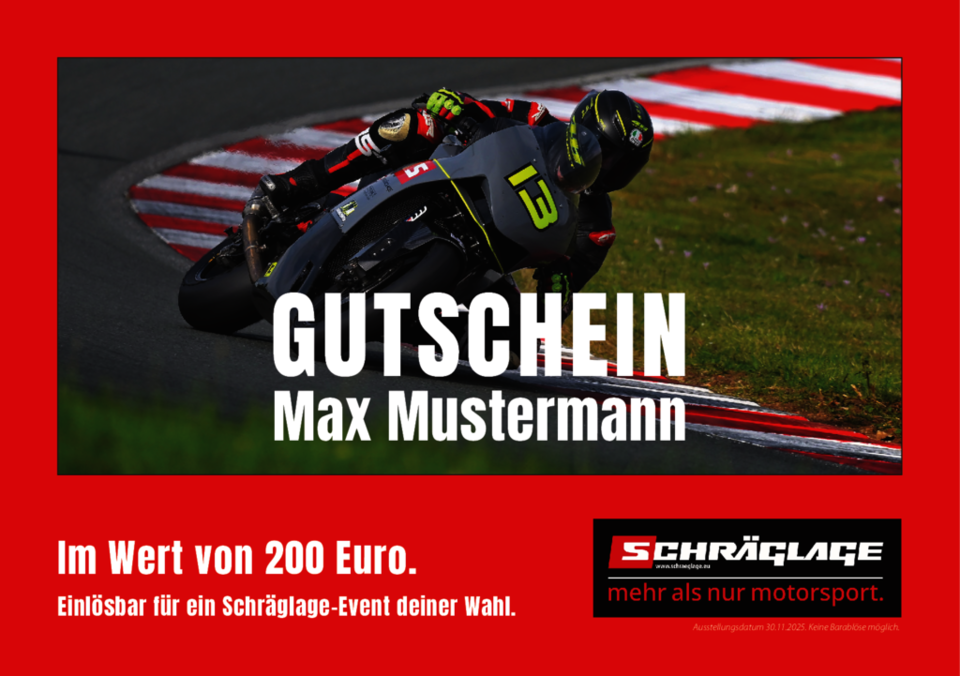 Ob Geburtstag, Weihnachten oder einfach nur so – ein Schräglage-Gutschein ist immer ein Volltreffer für alle, die Benzin im Blut haben.